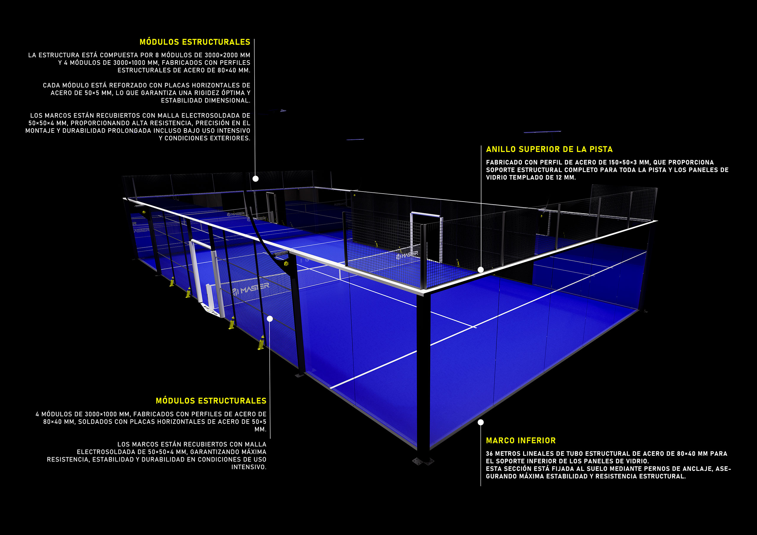 - Anillo superior de la pista compuesto en perfil 150x50x3mm. para la sujeción completa de la pista y los cristales de 12 mm.